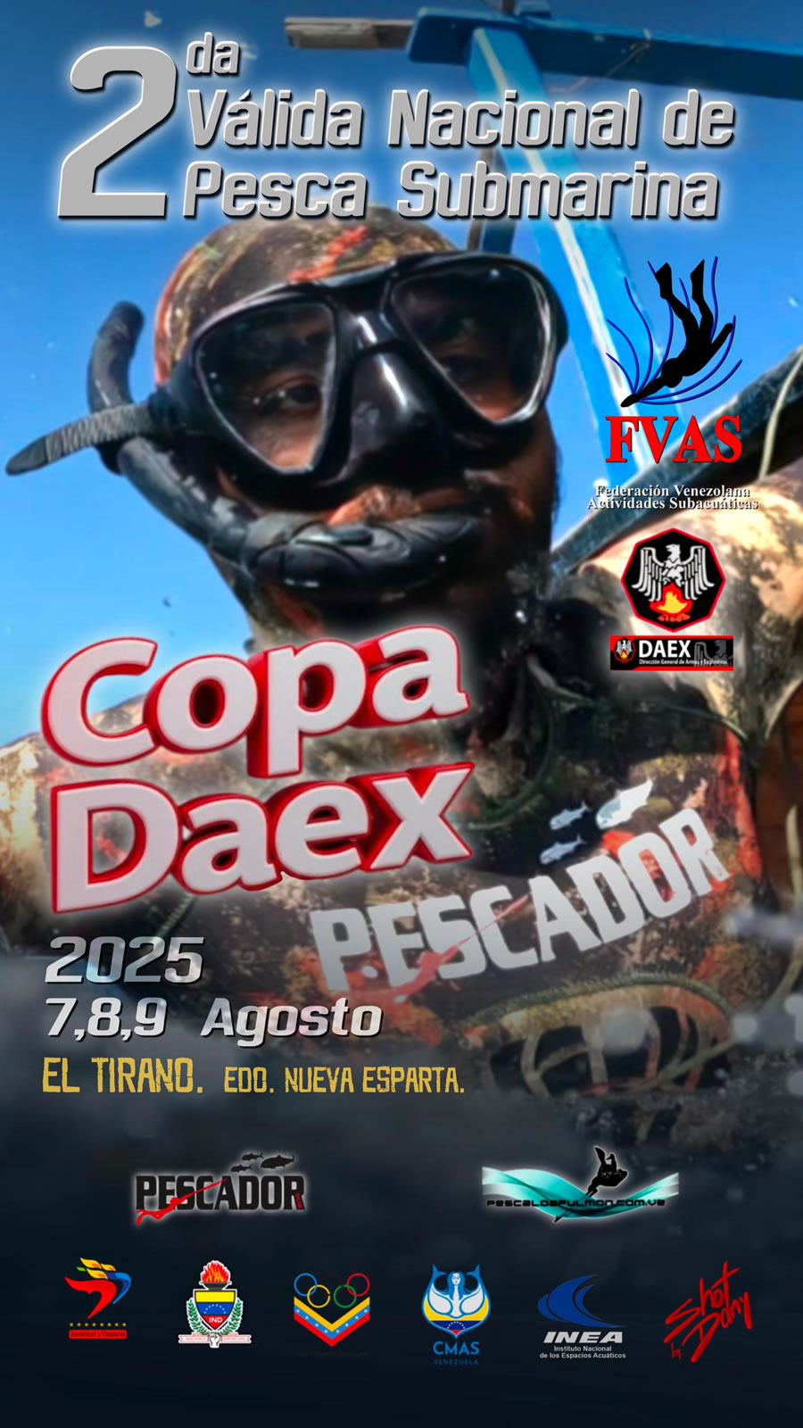 La 2da Válida Nacional de Pesca Submarina de la Federación Venezolana de Actividades Subacuaticas «Copa DAEX 2025» se llevó a cabo los dias 7, 8 y 9 de agosto de 2025 (doble jornada de competencia) en El Tirano, Estado Nueva Esparta. El evento fue organizado por Péscalo a Pulmón.