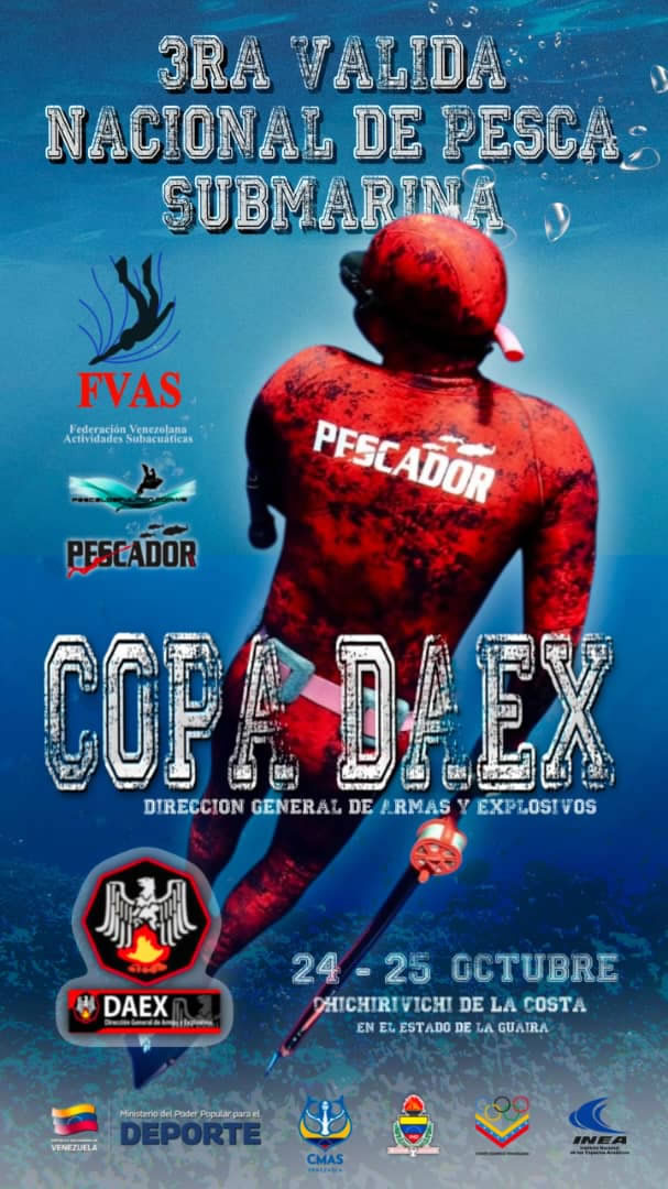 La 3ra Válida Nacional de Pesca Submarina de la Federación Venezolana de Actividades Subacuáticas «Copa DAEX 2025» se llevará a cabo los días 24 y 25 de octubre de 2025 (doble jornada de competencia) en Chichiriviche de la Costa, Estado La Guaira. El evento será organizado por Péscalo a Pulmón.