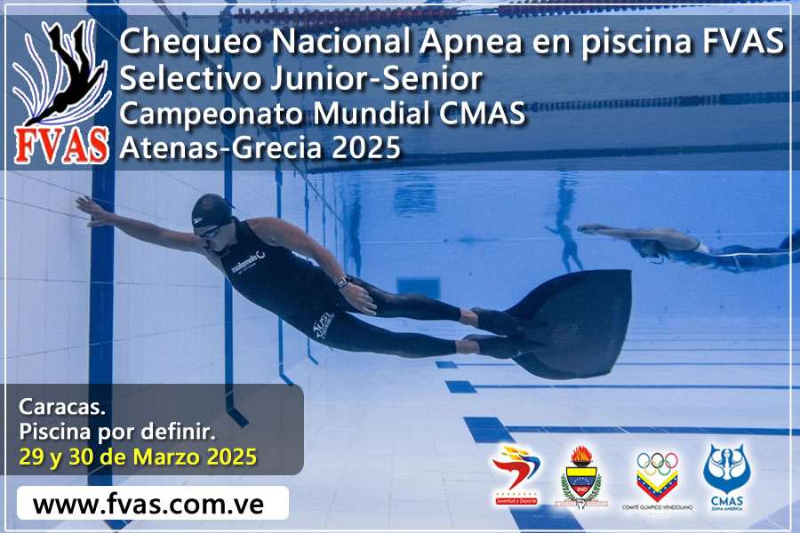 La Federación Venezolana de Actividades Subacuáticas (FVAS), realizó el CHEQUEO NACIONAL DE APNEA en PISCINA los días sábado 29 y domingo 30 de marzo de 2025 en el Complejo de piscinas «Prof. Roberto Flores» de la Academia Militar del ejército, ubicada en Fuerte Tiuna, Caracas.